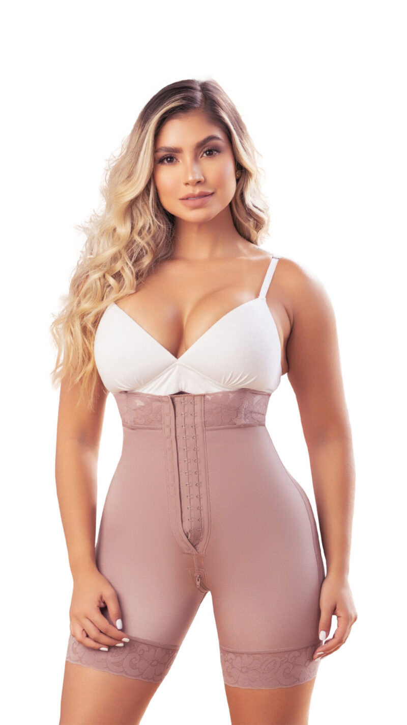 Mid thigh short, made of bidirectional and powernet fabric, high compression, 3 rows of claps in front., perineal zipper, strapless back , short rods at the waist, seamless shapewear on the buttocks, buttocks lifter, silicone lace.